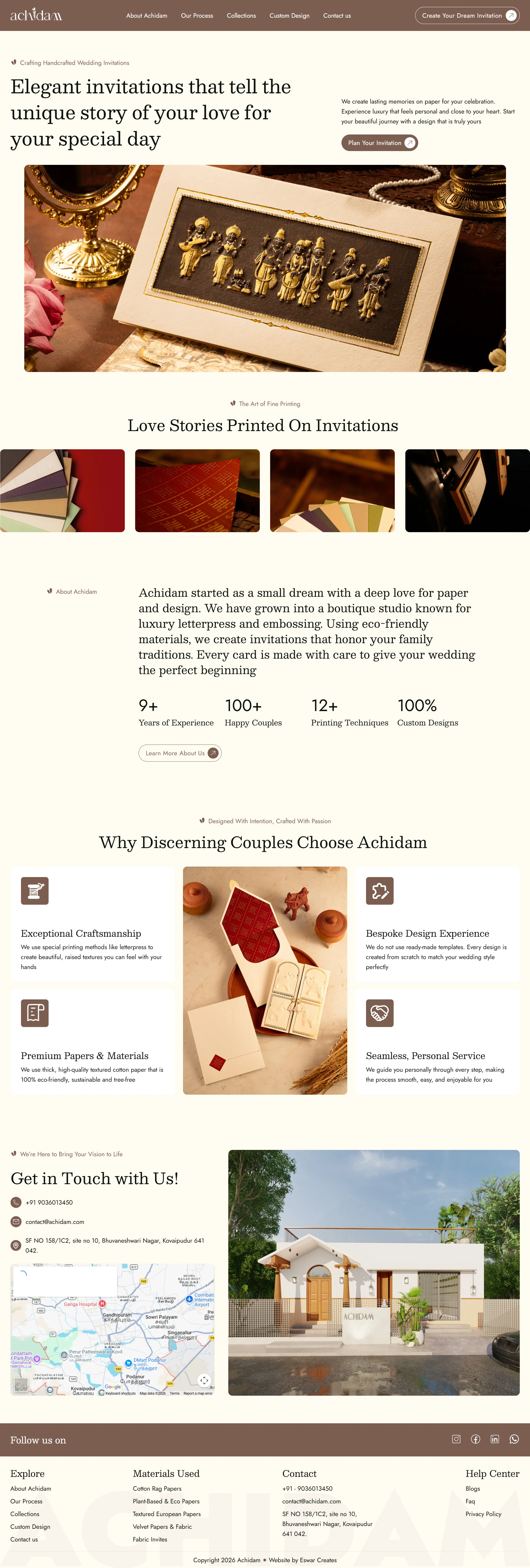 Achidam Studio offers a luxury collection of handcrafted invitations, blending letterpress and embossing with intentional design to tell your unique love story. With sustainability at the heart of its craft, the brand uses eco-friendly, tree-free papers to honor family traditions and envisions a future of timeless elegance. Collab with Eswar web developer